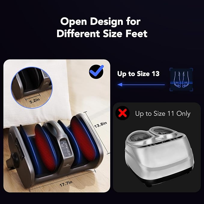 - Versatile Use: With a 360° adjustable stand and open design, this foot massager can target feet, calves, thighs, and arms, providing flexibility whether seated or lying down. Simply press the button and adjust it to your desired massage angle.