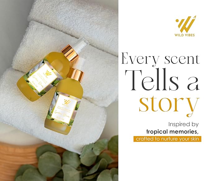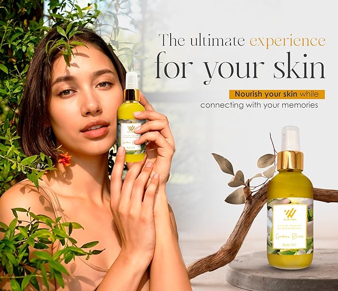 - Package includes: One 4 oz bottle of Wild Vibes Gardenia Blooms body oil, presented in a sophisticated frosted glass container with golden detailing—an essential for glowing, radiant skin care.