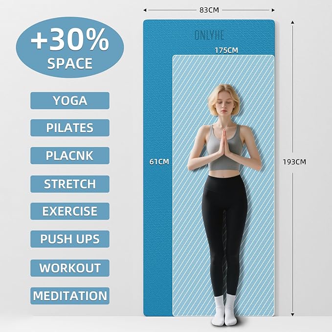 - 【ADDITIONAL SPACE DESIGN】193x83cm oversized surface (30% larger than standard mats) provides ample room for all yoga poses and dynamic movements