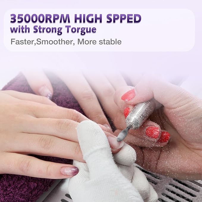 - Powerful Motor with Speed up to 35,000 RPM: This professional nail drill is equipped with a high-quality brushless motor that rotates the variable speed control button to make it work smoothly at an adjustable speed (0-35,000 RPM). For salon professional nail technicians or people who want to start their nail beauty at home, this is an ideal nail drill machine.
