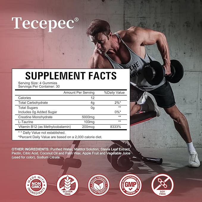 - 3 in One Creatine Monohydrate Formula: Tecepec creatine monohydrate gummy is made by combining 5000mg creatine with L-taurine, vitamin B12, better for building muscle, strength and recovery muscle.