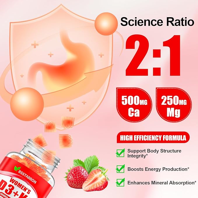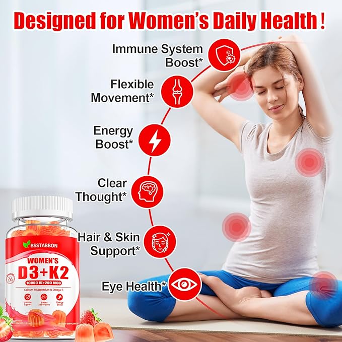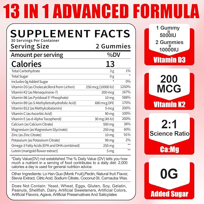- omprehensive Nutrient Absorption System:Our gummies provide 10000 IU of Vitamin D3 and 200 mcg of Vitamin K2 in highly absorbable forms. This powerful combination enhances calcium absorption, while methylated B vitamins (B6, B9, B12) support healthy metab0lism. With added calcium, magnesium, and zinc for complete mineral support, the formula is enriched with Vitamin C, E, Omega-3s, and lutein to offer comprehensive anti0xidant protection and essential nutrients.