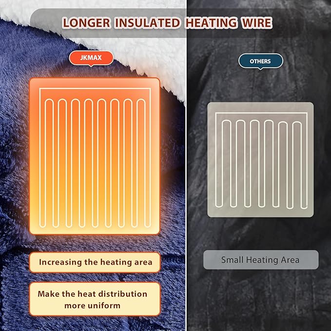 - SAFE CHOICE: JKMAX Heated blanket has passed UL 964 safety standard testing and obtained ETL certification, ensuring quality. The heating wire designed by a Japanese company through advanced technology has excellent insulation and stronger flame retardancy. The built in NTC overheat protection system actively monitors temperature to prevent overheating risks and ensure absolute safety during operation