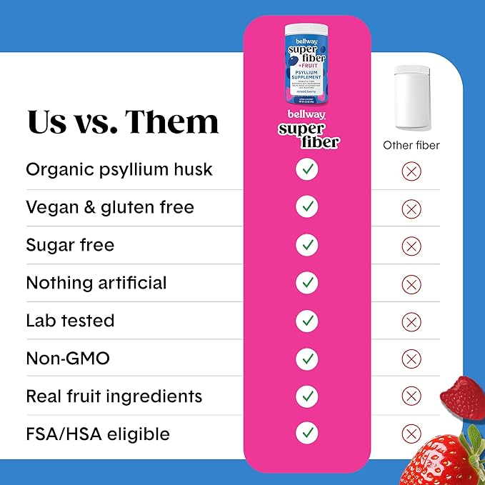 - Blended in the USA: Bellway Super Fiber + Fruit is plant-based, made with organic psyllium husk and contains both soluble and insoluble fiber, in addition to being non-GMO, gluten-free, aspartame-free, lab-tested, and free of artificial ingredients.