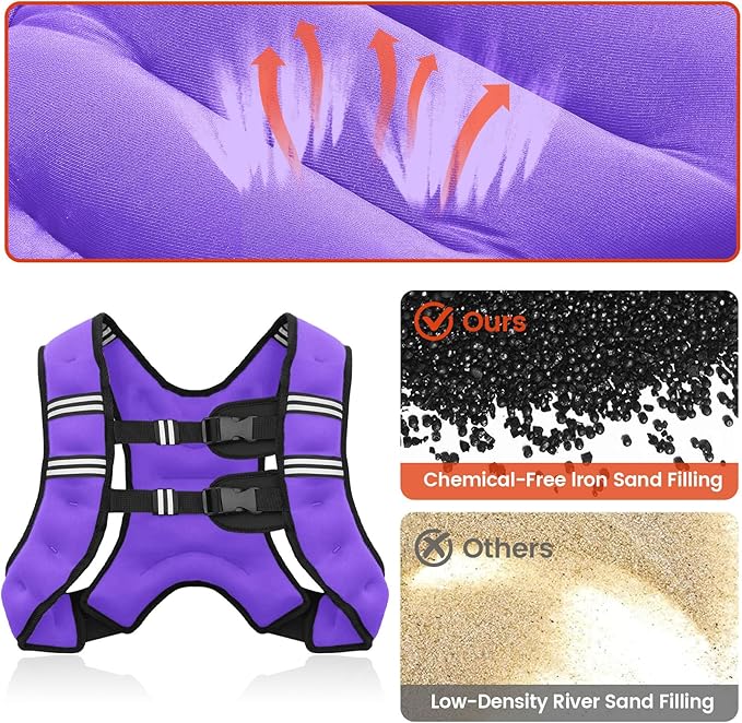 - EVEN WEIGHT DISTRIBUTION - The vest is evenly filled with iron sand, ensuring an even weight distribution. This helps to minimise the risk of injury during exercise.