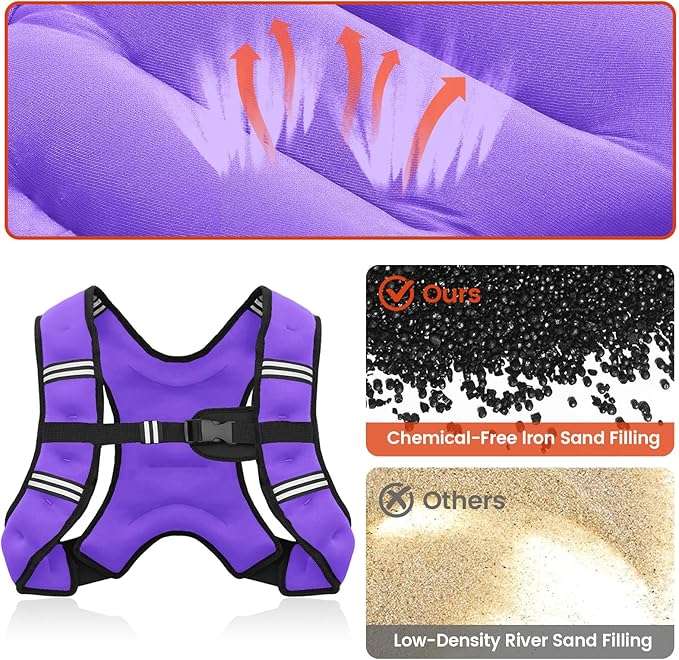 - EVEN WEIGHT DISTRIBUTION - The vest is evenly filled with iron sand, ensuring an even weight distribution. This helps to minimise the risk of injury during exercise.