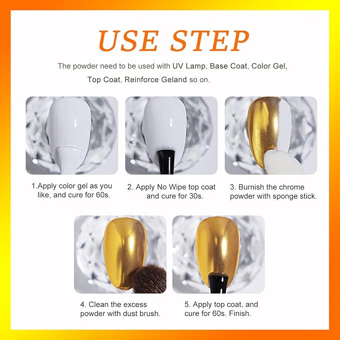 - Wide Application: The nail chrome pigment powder is suitable to be applied on UV gel nails, acrylic nails, natural nails etc, a helpful DIY tool for nail art design. Different polish will give different actual effect with nail glitter for nail art. Trying different color polish can also bring more fun to you with the chrome powder for gel nails polish