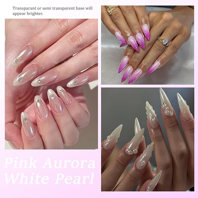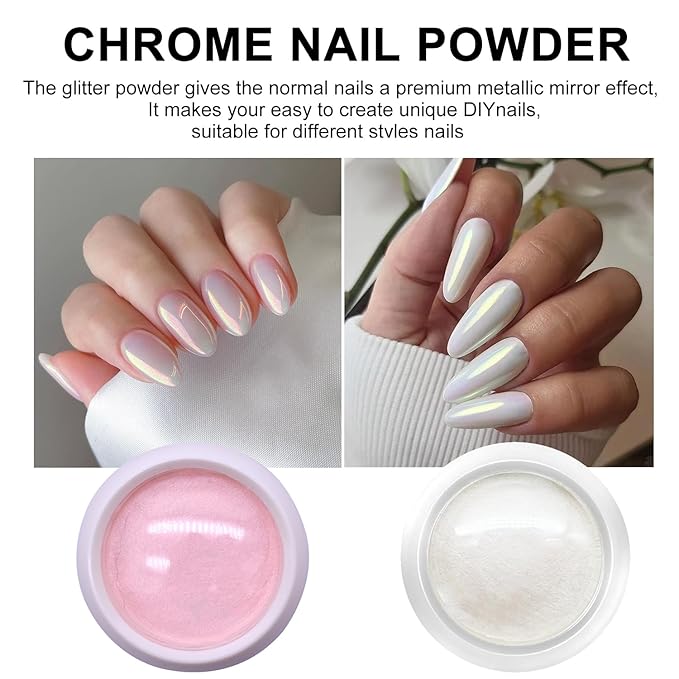 - GZMAYUEN Nail Powder Set: 4 jar chrome nail powder with 4 sponge stick. (1 jar gold chrome powder, 1 jar sliver nail chrome powder, 1 jar white pearl / sheer /glass chrome pwoder for gel nails, 1jar pink aurora/iridescent chrome nail powder)