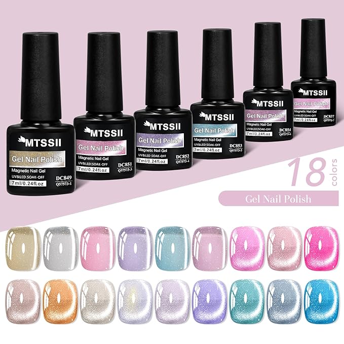 - Cat Eye Gel Nail Polish : The cat eye gel nail polish kit includes 18 colors magnetic gel polish, 1 magnet stick. All in 1 kit, save your money and time to nail salon! Enjoy the DIY fun of nail beauty at home. Suitable for natural nails, false nails, acrylic nails, etc.
