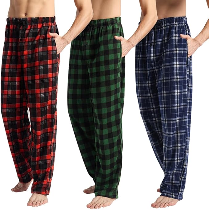 3 Pack Men's Fleece Pajama Pants Bottoms– Lounge Sleepwear Plaid PJs with Pockets and Button Fly