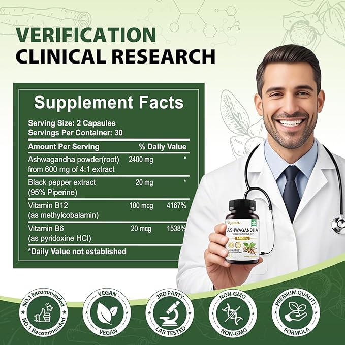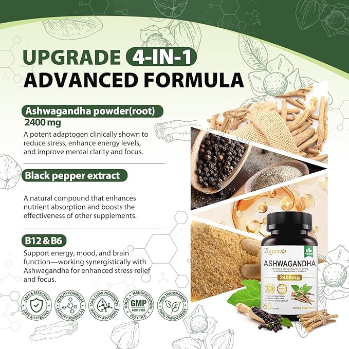 - 【HIGH-POTENCY ASHWAGANDHA 2400MG】– Experience the power of nature with Royavita Ashwagandha 2400mg – a potent, plant-based adaptogen designed to help reduce stress and boost overall energy and vitality. Formulated with black pepper extract for enhanced absorption and organic vitamins B6 & B12 for mental clarity and sustained energy.