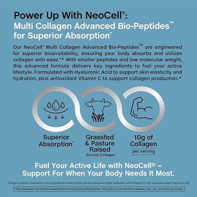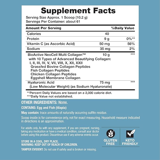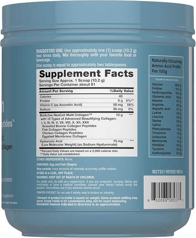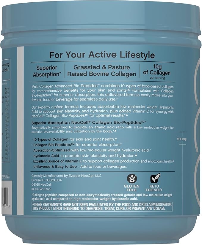 NeoCell Multi Collagen Bio-Peptides Powder | 22oz | Advanced with Hyaluronic Acid and Vitamin C | 10 Super Types of Collagen | Superior Absorption | Grassfed Protein Supplement |