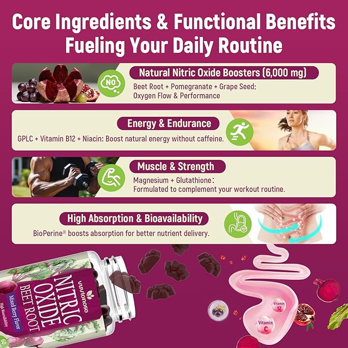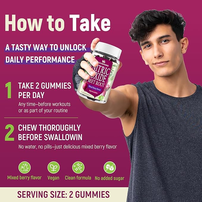 - Mixed Berry Flavor: Sugar-free nitric oxide gummies with a refreshing blend of berries and pomegranate — a tasty way to enjoy beetroot daily