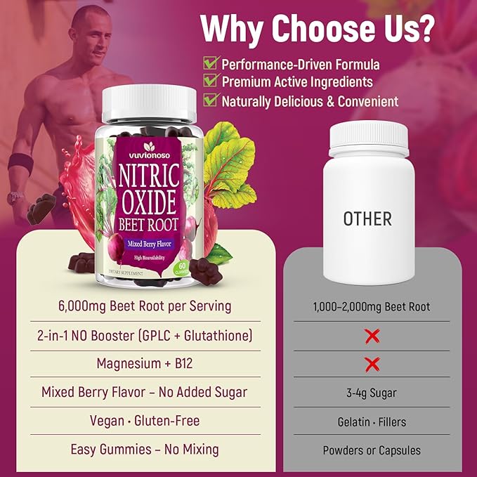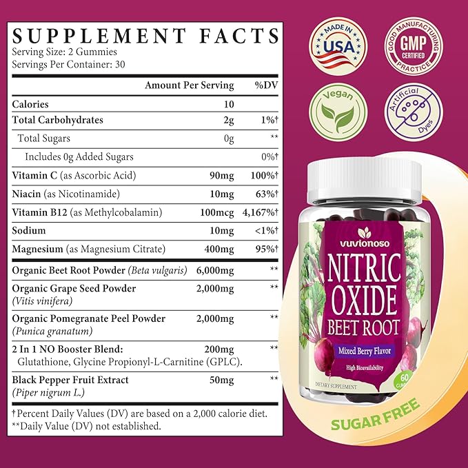- Mixed Berry Flavor: Sugar-free nitric oxide gummies with a refreshing blend of berries and pomegranate — a tasty way to enjoy beetroot daily