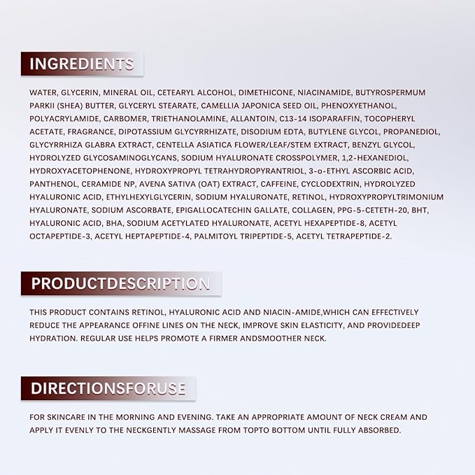 - [Firming, Tightening & Anti-Aging]:Retinol stimulates collagen regeneration in the deep layers, peptides smooth wrinkles in the middle layers, and hyaluronic acid enhances moisture and plumpness on the surface. This neck cream works on all three layers of the skin to deliver visible firming and anti-aging benefits