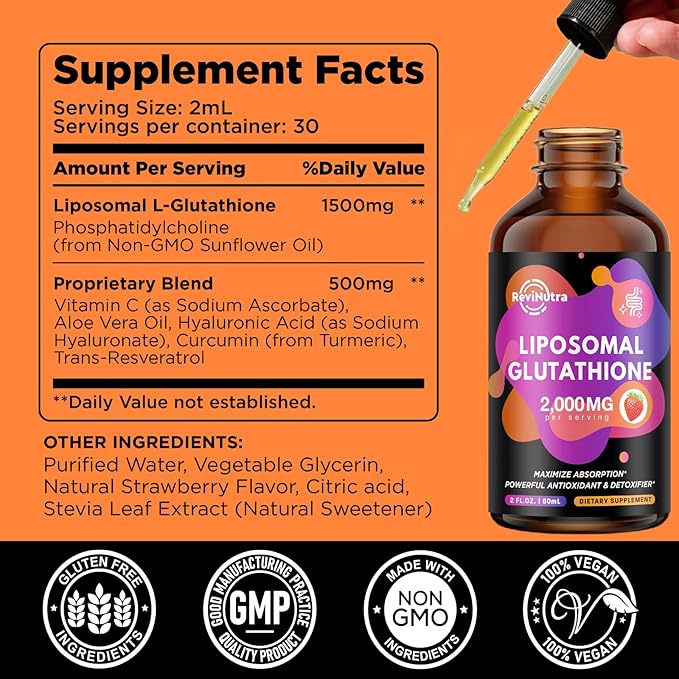- LIPOSOMAL BIOAVAILABILITY: ReviNutra liposomal Glutathione supplement utilizes advanced liposomal technology for up to 98% absorption, allowing for faster and more efficient delivery of glutathione to the body. Unlike capsules or pills, this liquid form works quickly for better results