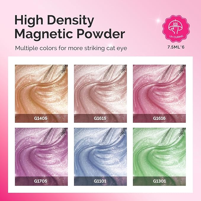 - MULTIPLE COLORS CAT EYE EFFECTS: The package includes 6 bottles of 0.26 fl oz cat eye gel polish in different colors with the magnetic stick that let you create desired effect with ease. Featuring ultra-fine magnetic powder, the polish reacts instantly to the magnet, delivering a shimmery finish that stands out wherever you go.