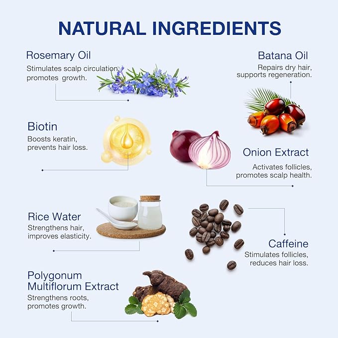 - Nourishing Hair Growth Formula: Infused with powerful ingredients like Rosemary, Biotin, Batana Oil, Rice Water, Onion and Castor Oil to support hair health. These natural elements work synergistically to stimulate scalp circulation, nourish follicles, and promote thicker, fuller hair growth.