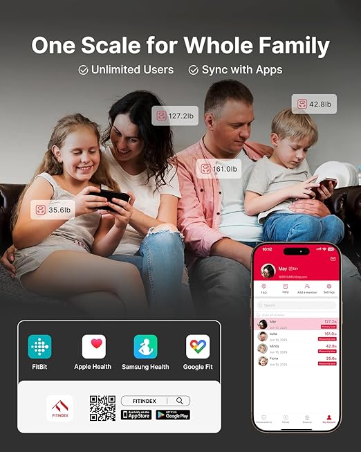 - User-Friendly App: The smart scale with Fitindex App can create over 30 user profiles, managing each person's data separately. The Fitindex app provides detailed charts and trends for 50 body composition metrics over weeks, months, or years, helping you track health and fitness goals with precision and convenience. It is compatible with Apple Health, MyFitnessPal, and Samsung Health, and can also sync with Apple Watch.