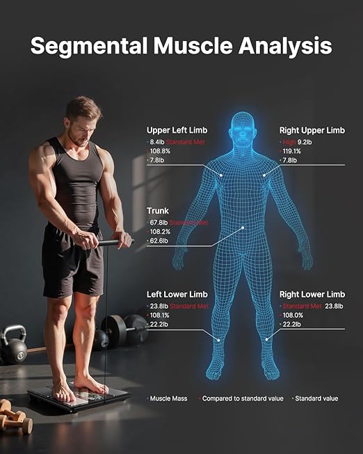 - Targeted Fitness Insights: This body fat scale lists out the segmental muscle and fat of left arm, right arm, trunk, left leg and right leg instead of just analyzing body composition for the whole body, which helps you create a specific exercise plan.