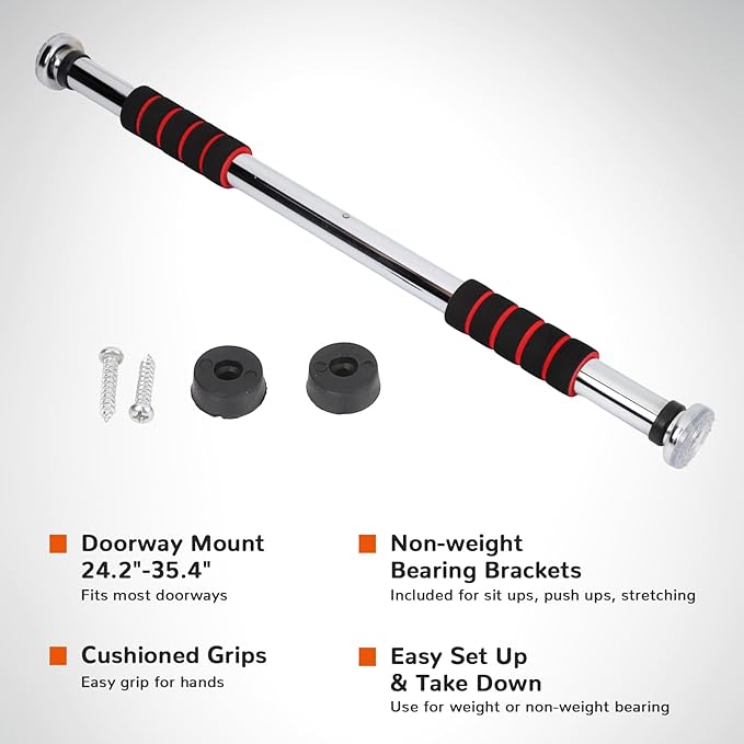 - Hardware Included: This premium Pull-Up bar comes with all the hardware you will need, a set of safety brackets with screws, and set of sit up plugs, only a screwdriver or drill is required; For safety and stability, screws are required for mounting