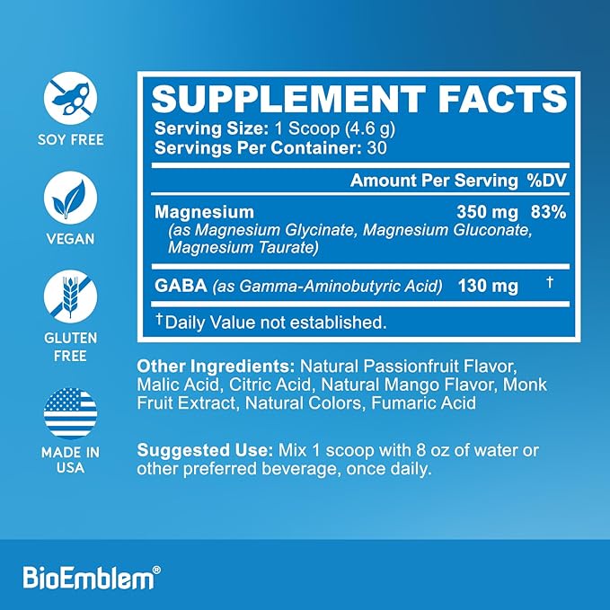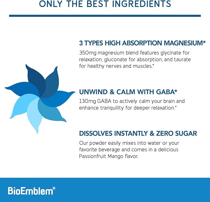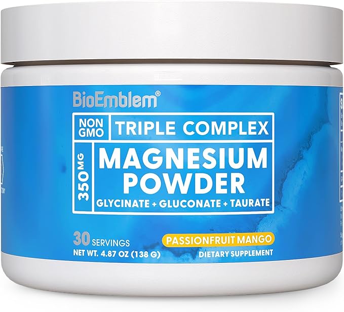 BioEmblem Triple Magnesium Powder Drink - 350mg High Absorption Magnesium Glycinate, Gluconate, Taurate & GABA for Rest, Sleep, & Brain Health - Passionfruit Mango Flavor - Vegan - (30 Servings)
