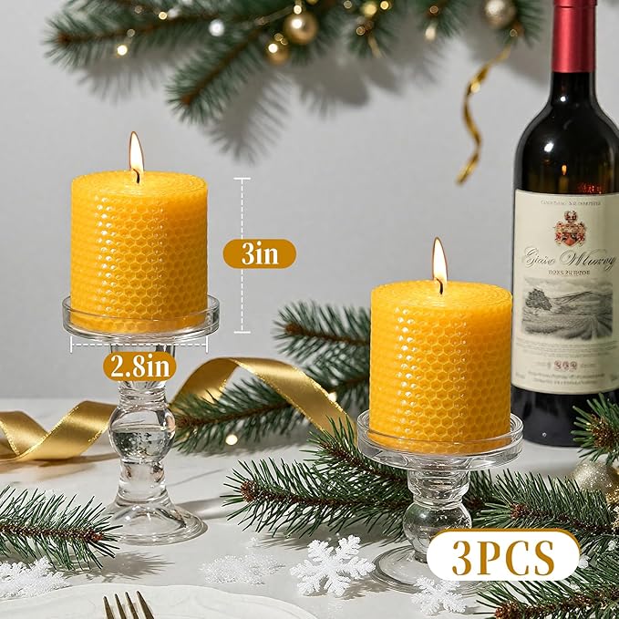 Hand-Rolled Beeswax Candles,2.8x3in-3PCS,All Natural Honeycomb Beeswax Pillar Candles,72 Hours Long Burning Bees Wax Candles for Home,Dripless Smokeless Unscented Honeycomb Pillar Candle