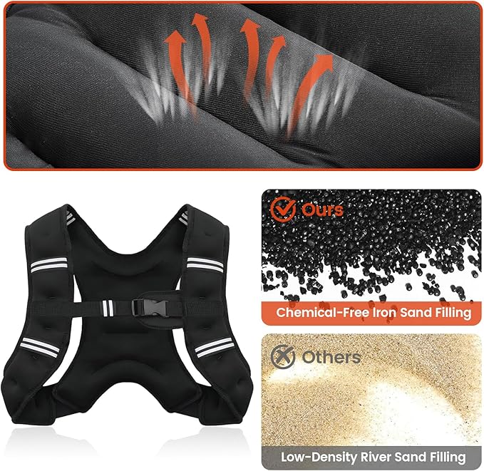 - EVEN WEIGHT DISTRIBUTION - The vest is evenly filled with iron sand, ensuring an even weight distribution. This helps to minimise the risk of injury during exercise.