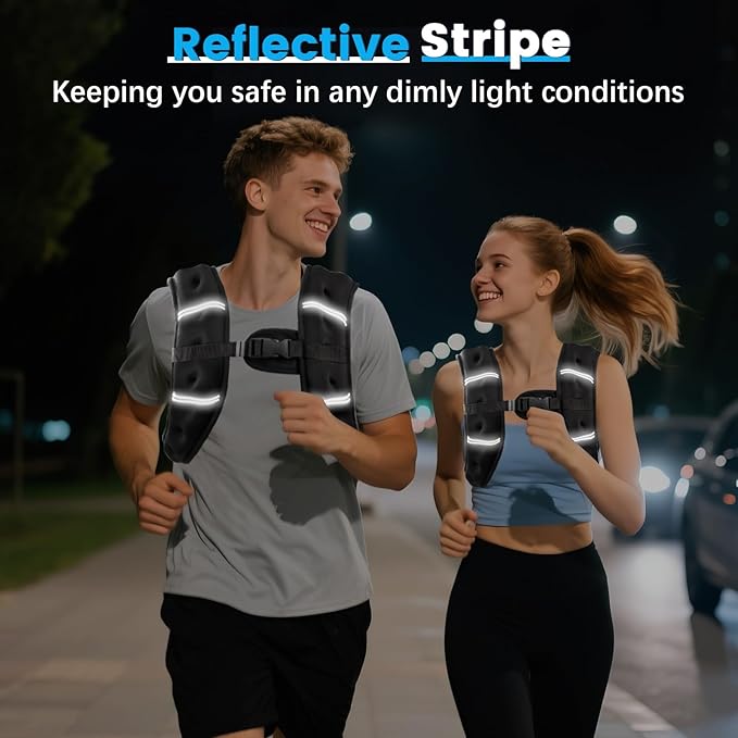 - THOUGHTFUL DESIGN -The adjustable weighted vest has reflective strips on the front and back to ensure the safety of the user in low-light environments. There is an elastic mesh pocket on the back to store mobile phones, car keys, and other personal belongings.