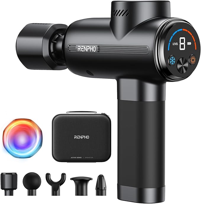 - Command Your Recovery: With its integrated VA display, the RENPHO Percussion Massage Gun allows you to clearly monitor speed, battery, and temperature settings, and effortlessly switch between heat and cold therapy without interrupting your massage