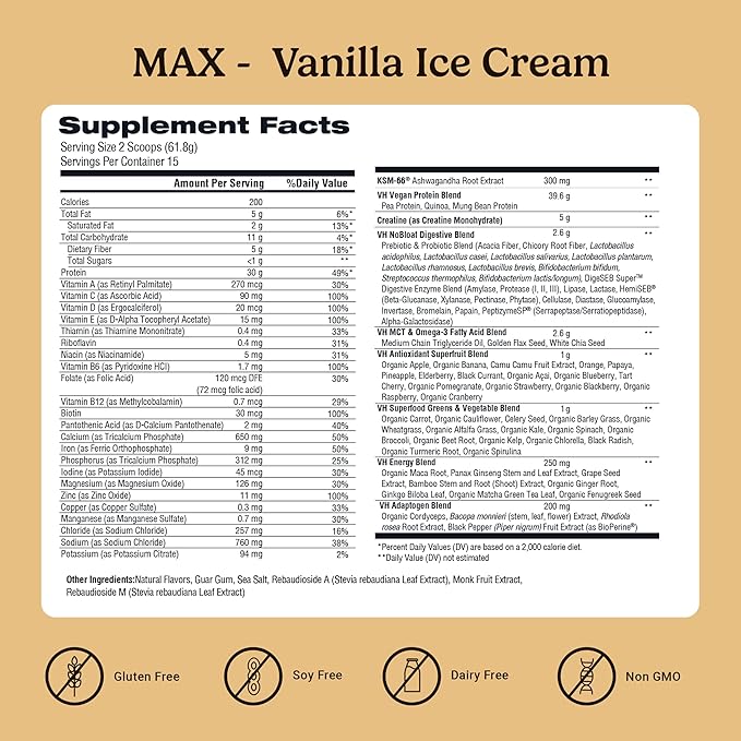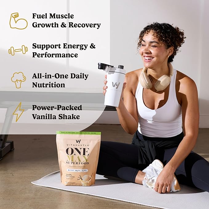 VitaHustle ONE Max Protein + 5g Creatine, 30g Plant Protein Powder, All-in-One Meal Replacement Shake with Greens, Adaptogens, Ashwagandha, Probiotics & Vitamins – Vanilla Ice Cream, 15 Servings