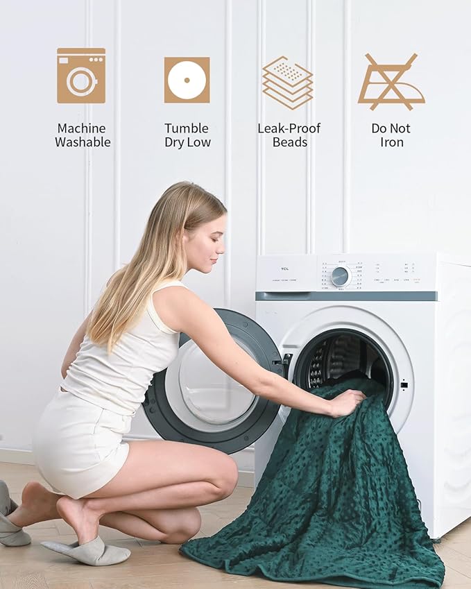 - Easy Care & Durable: Our weighted blanket is designed for effortless maintenance. It's machine washable and can be tumble dried on low heat. Its multi-layered structure holds the glass beads in place and prevents leakage. Enjoy peace of mind with our 12-month guarantee.