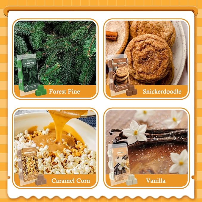- Seasonal Scents for a Cozy Fall: Enjoy the cozy aroma of Pumpkin Pie, the crisp sweetness of Apple Cider, and the warming spice of Cinnamon. Autumn Wreath brings earthy, festive notes, while Forest Pine offers a refreshing woodland escape. Indulge in the nostalgic scents of Snickerdoodle and Caramel Corn, and unwind with the soothing Vanilla. Each melt fills your home with rich, seasonal fragrances, perfect for creating a warm, inviting atmosphere.