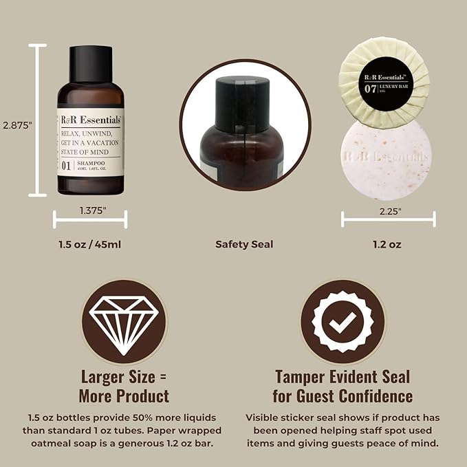 - Why choose R&R Essentials: The upscale amber bottles are a generous size at 1.5fl oz - 50% more liquid than the standard 1oz size. Our kit includes two hotel soaps, one body bar soap for the shower and a mini soap for the sink. The classic apothecary style enhances any decor, and the fun saying on the label will make your guest smile! Perfect for hotels, resorts, vacation rentals, Airbnb, VRBO and gift baskets.