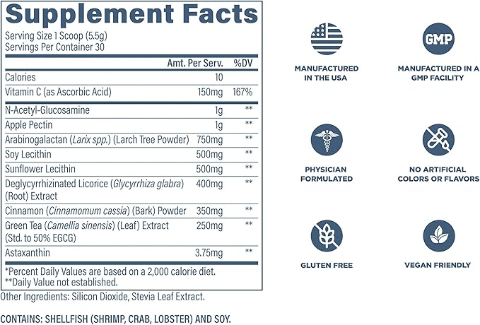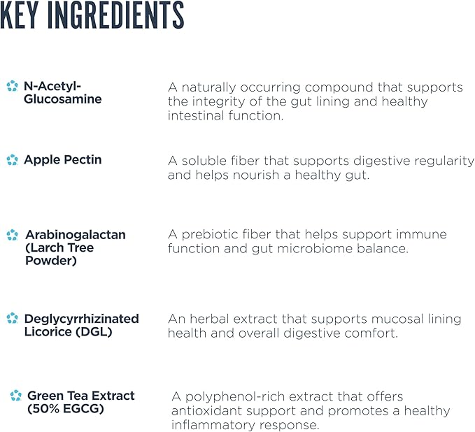 - Key Ingredients: GI+ contains a blend of ingredients that work together to help improve nutrient absorption and overall gut health. Natural ingredients like Apple Pectin, Sunflower and Soy Lecithin, Cinnamon Bark Powder, and Green Tea Leaf Extract work to optimize digestion, support the stomach lining, enhance bowel stability, and improve your overall energy and confidence.