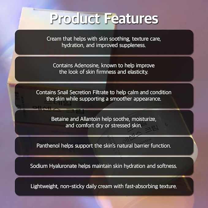 - Snail Mucin-Powered Skin Renewal: Infused with Snail Secretion Filtrate, this cream helps refine skin texture and supports elasticity. Helps reduce the appearance of fine lines and improves skin resilience over time.