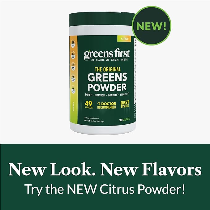 Greens First Original Greens Powder - 49 Superfoods - Organic Fruits & Veggies - Prebiotics, Probiotics & Digestive Enzymes - Antioxidant Smoothie - Dairy Free/Vegan/Non-GMO (Citrus, 30 Servings)