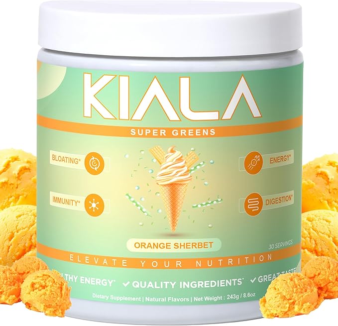 - CREAMY ORANGE SHERBET FLAVOR: Treat your taste buds to the nostalgic, creamy citrus delight of Orange Sherbet Kiala Super Greens. Say goodbye to bitter, grassy flavors – this refreshing blend is crafted to be enjoyed on its own or mixed into your favorite cold beverages, making it easy to keep up with your wellness routine while savoring a flavor you’ll actually look forward to. With zero sugar, it delivers sweetness in a clean, refreshing way you can enjoy every day.