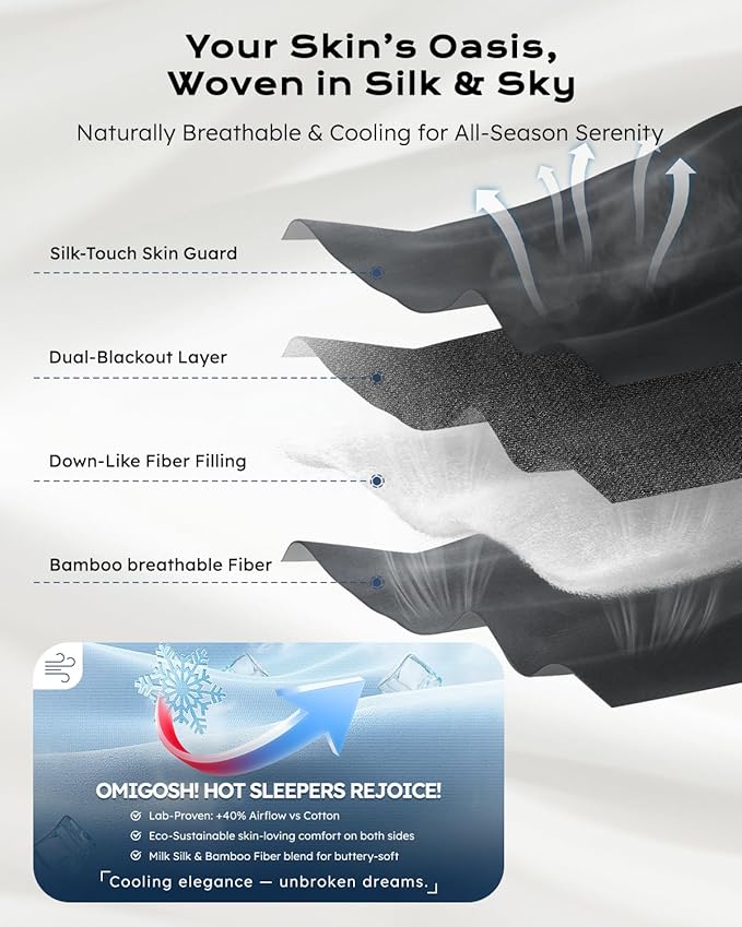 - Dual-Sided Luxury, Single-Minded Serenity! Experience the Cloud Like Dual-Fabric Magic – one side features skin-cooling Milk Silk for hot nights, the other offers breathable Bamboo Fiber for year-round comfort. Reversible design adapts to your mood: sleek satin for evening elegance, matte finish for daytime chic. No more compromising between style and function