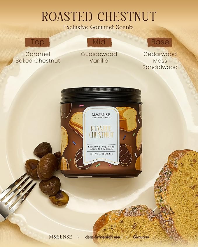 M&SENSE Roasted Chestnut Scented Candle, 11.6oz Natural Soy Wax, 70 Hours Long Lasting Clean Burn, Warm Nutty Aroma for Holiday Home Decor, Non-Toxic Relaxing Winter Gifts for Women