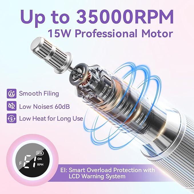 - Quiet, Low Heat & Low Vibration: This upgraded 15W aluminum handpiece runs under 60dB with minimal vibration. The nail drill machine stays cool during long sessions thanks to its efficient internal cooling system
