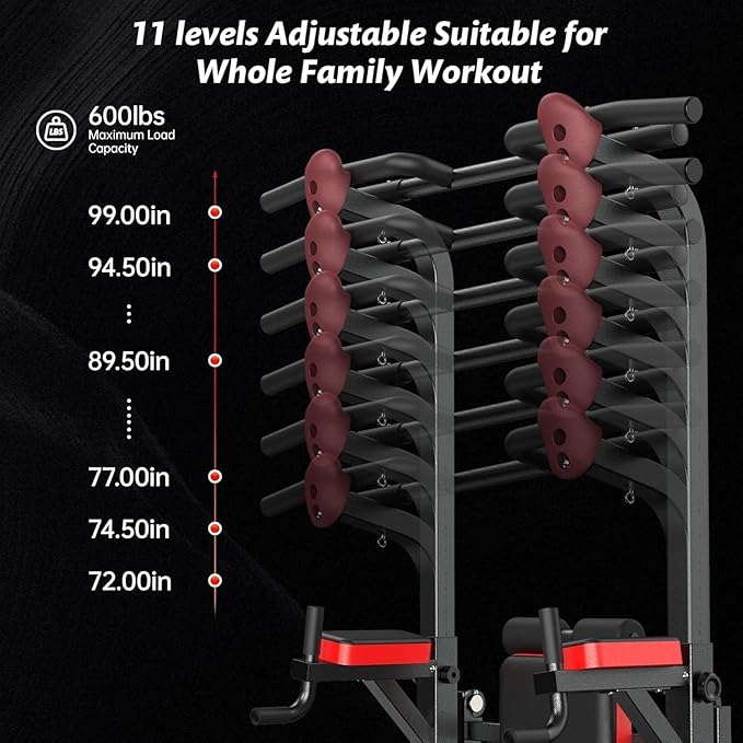 - Adjustable Height and Backrest - The 11 levels adjustable height range is 71.4 inches to 94 inches with the lowest setting designed for children and 7 adjustable wide-fitted backrest. The Dip Station is more comfortable for you to do exercise and suitable for the whole family's needs at home gym.