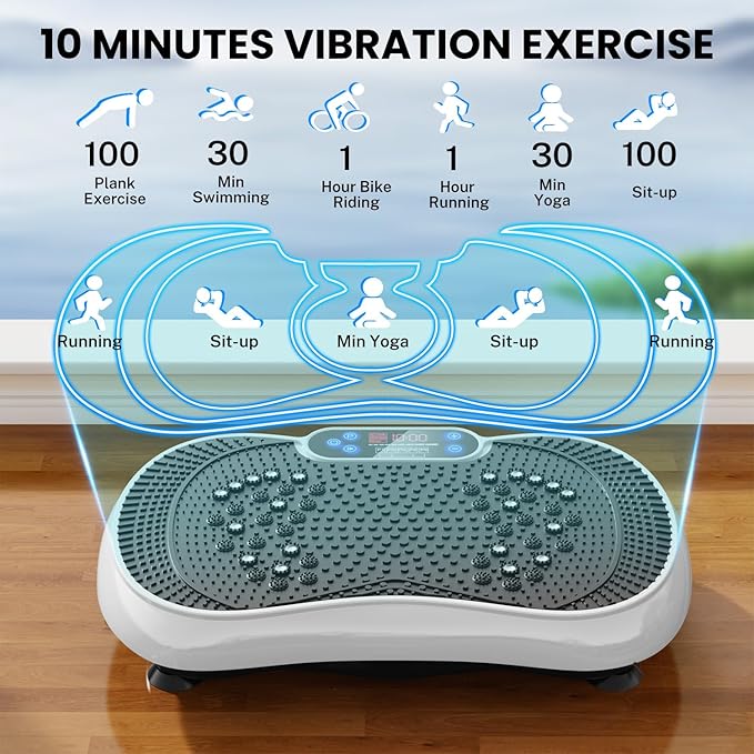 - EFFICIENT BODY SCULPTING: Experience full-body vibrations that deeply engage your muscles and enhance muscle contractions. This vibration plate helps you reach your fitness goals faster than traditional workouts—your body can process fat multiple times faster than running. Jump on your vibration machine and start shaping your ideal physique right away!