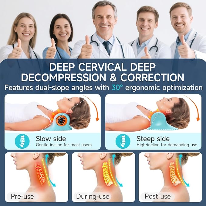 - ๐๐ซ๐ ๐จ๐ง๐จ๐ฆ๐ข๐ ๐๐๐ฌ๐ข๐ ๐ง & ๐๐ซ๐๐ฆ๐ข๐ฎ๐ฆ ๐๐๐ญ๐๐ซ๐ข๐๐ฅ๐ฌ - Crafted with skin-friendly silicone, this neck traction device is designed to naturally fit the contours of your neck. The advanced 3D design features dual-angle support (30ยฐ for gentle stretching and 45ยฐ for deeper extension) to maintain proper spinal alignment while providing comfortable stretching.