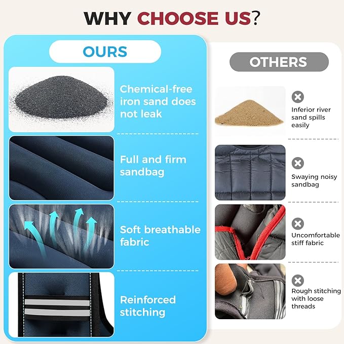 - Superior Performance: Our weighted vest features upgraded iron sand with even weight distribution, maximizing workout efficiency and minimizing injury risks. Reinforced double-stitched seams prevent sand leakage, ensuring a secure and durable experience for safe, effective training
