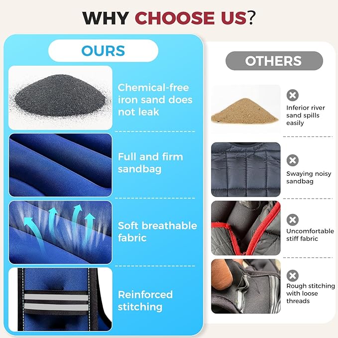 - Superior Performance: Our weighted vest features upgraded iron sand with even weight distribution, maximizing workout efficiency and minimizing injury risks. Reinforced double-stitched seams prevent sand leakage, ensuring a secure and durable experience for safe, effective training