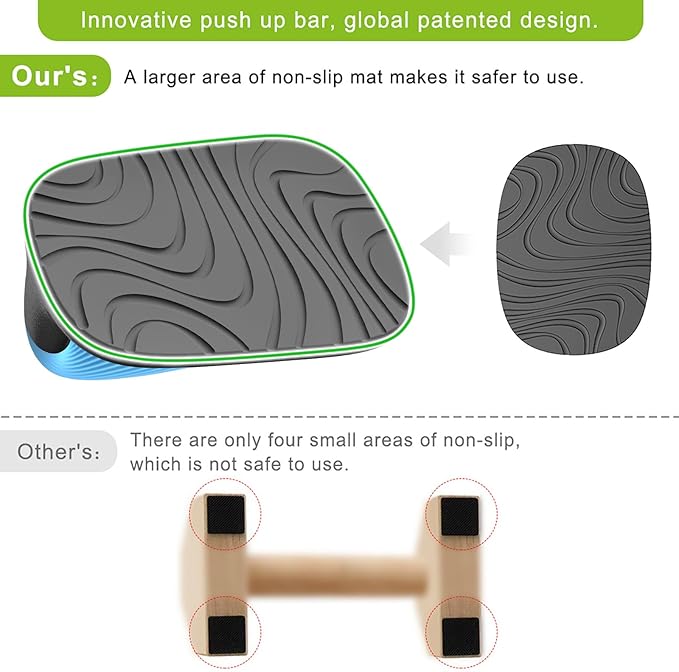 - Non-Slip Rubber Pad: There is a 5 1/2 * 7 9/10 inch large area rubber pad at the bottom, which is super anti-slip. Ensure that the push-up bar remains stable on various floor types without sliding, and higher safety protects you from injury during exercise