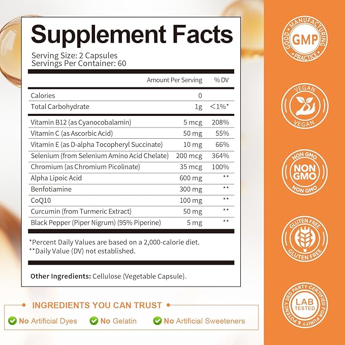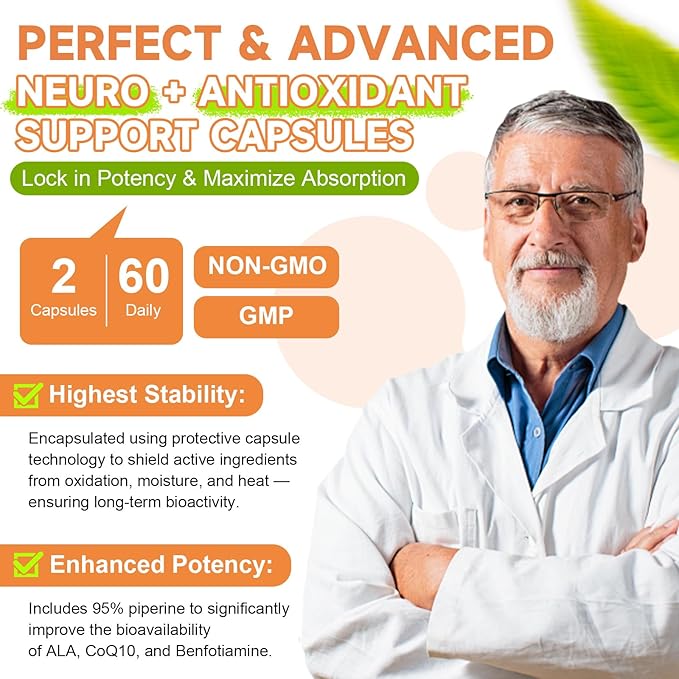 - Comprehensive Neuro & Metabolic Protection: Formulated with Benfotiamine, a fat-soluble form of Vitamin B1, plus essential B12 and Vitamin C, this blend supports nerve signal transmission, reduces occasional tingling or numbness, and helps combat oxidative nerve damage. Vitamin C and E work together to maintain nervous system integrity and protect against daily stressors.