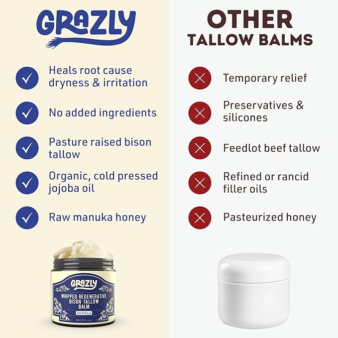 - IDEAL FOR VARIOUS SKIN TYPES: Grazly’s Whipped Bison Tallow Balm is ideal for various skin types, including those with irritation from eczema, rosacea, or sensitivity. The manuka honey and nutrient-rich bison tallow help reduce redness, soothe irritation, and balance moisture. This gentle, non-comedogenic balm nourishes the skin without clogging pores.