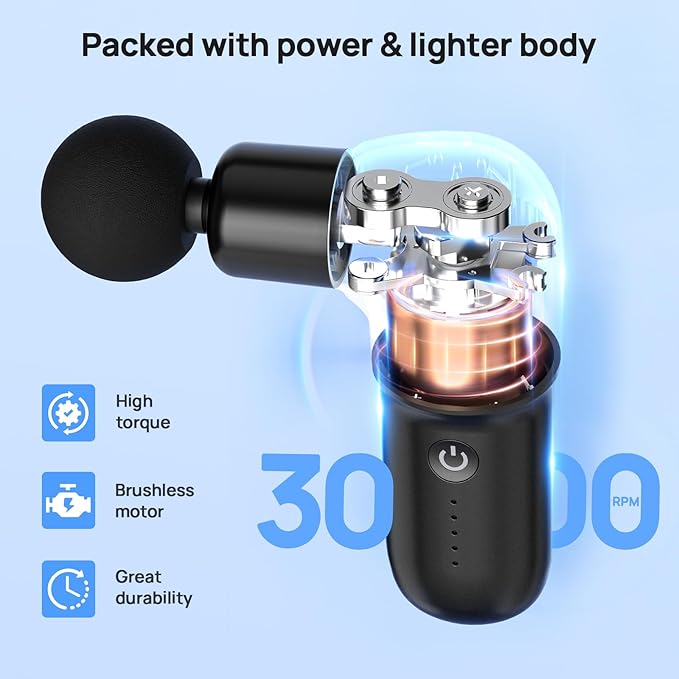 - [Mini Pocket Design] Our mini massage gun features an ergonomic L-shaped design and a skin-friendly feel that's sure to please. Weighing only 0.6 pounds, it's easy to carry around, whether at the gym, at the office, or while traveling. It slips easily into bags and pockets for a relaxing massage.